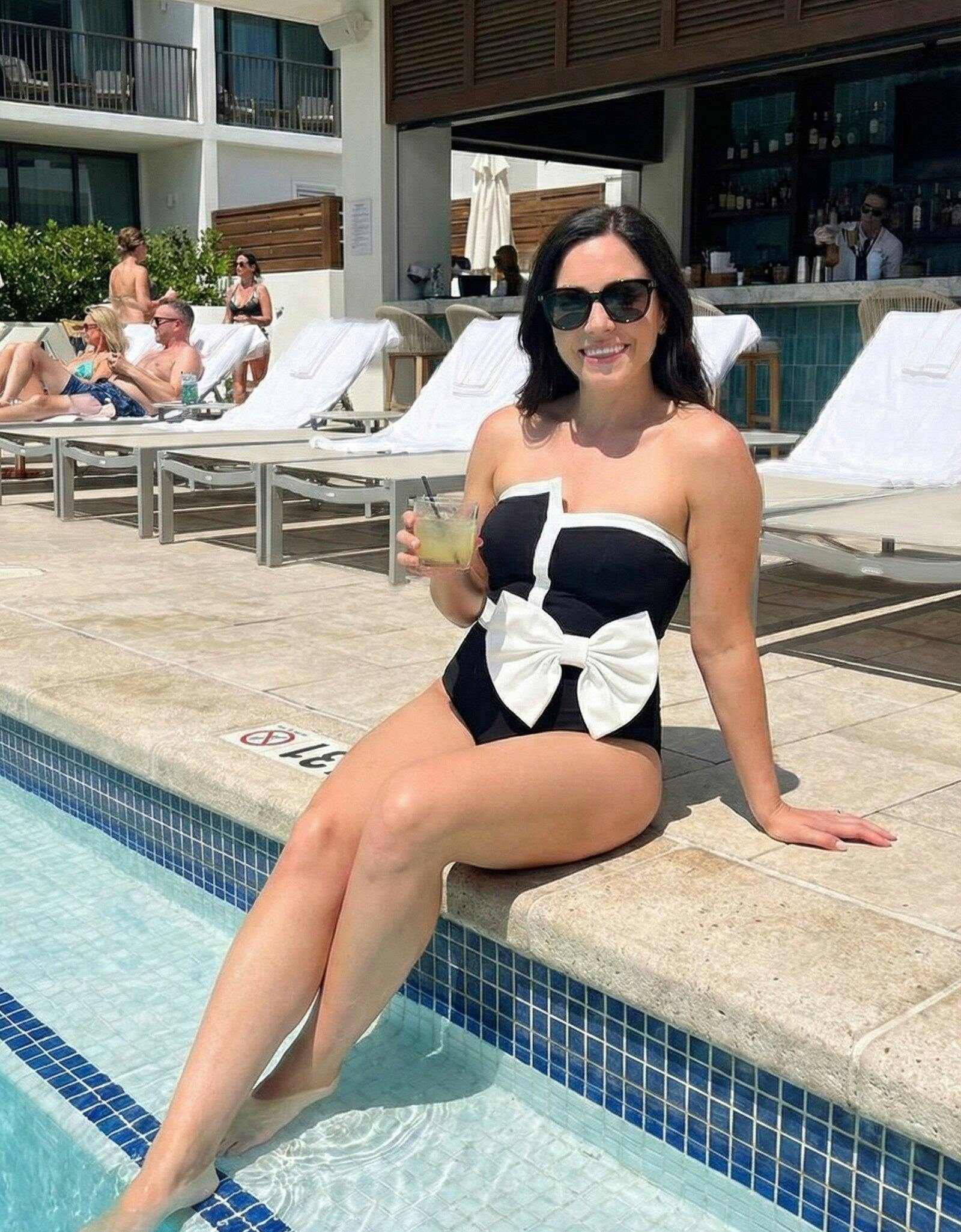 Women’s Black & White Color Block Strapless One-Piece Swimsuit with Bow Detail